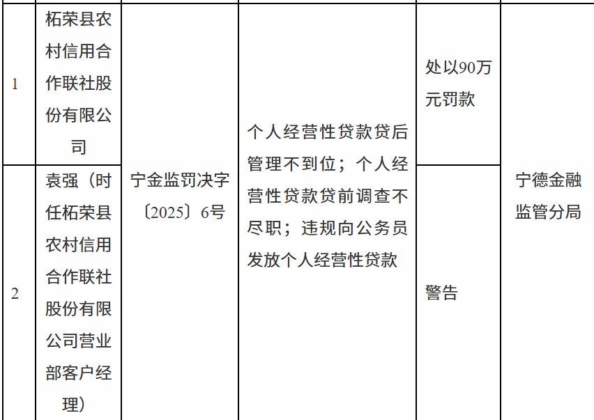 10月20日,宁德金融监管分局行政处罚信息公示表显示,柘荣县农村信用合作联社股份有限公司因个人经营性贷款贷后管理不到位;个人经营性贷款贷前调查不尽职;违规向公务员发放个人经营性贷款被处以90万元罚款;袁某被警告。